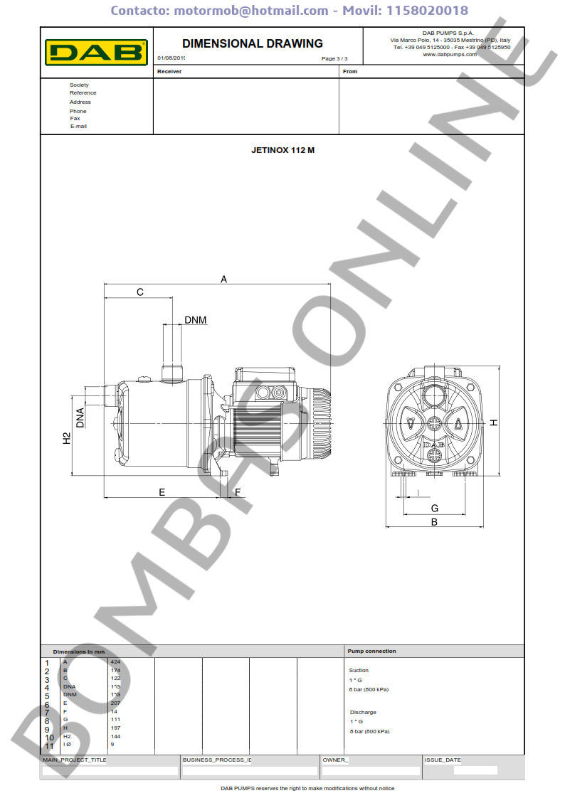 BOMBA DAB JETINOX 112 M – Autocebante – Monofasica – Articulo 102640060