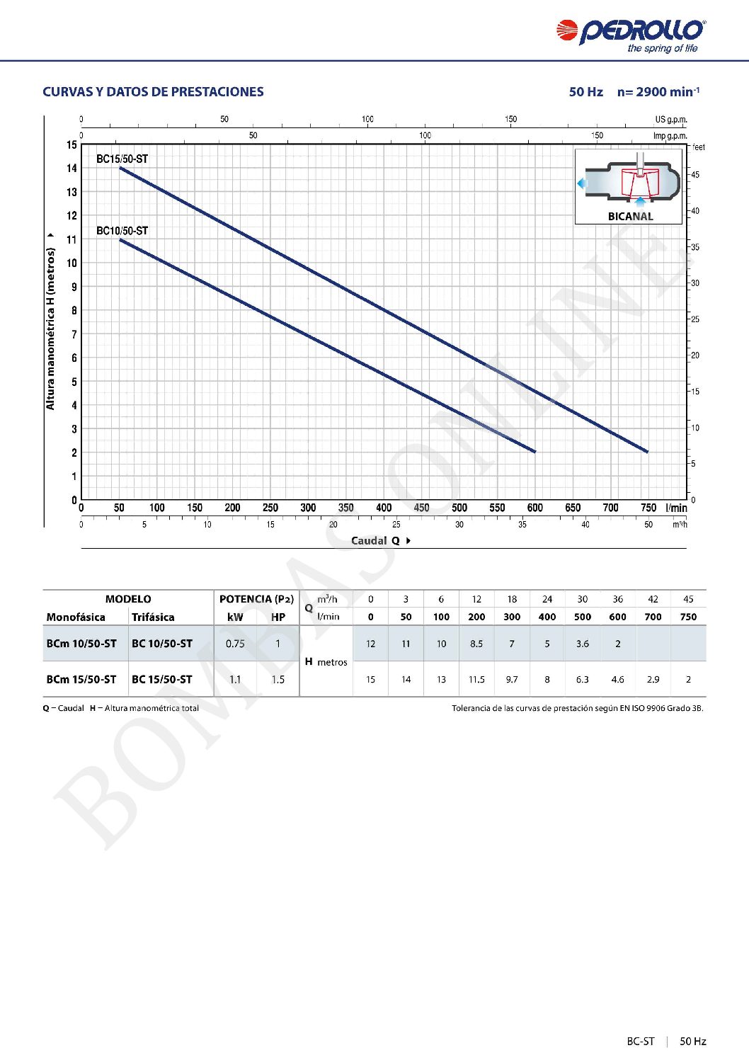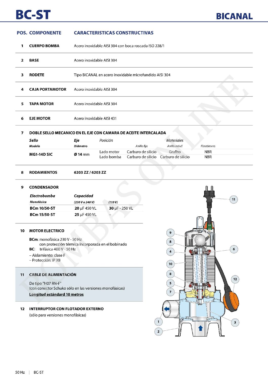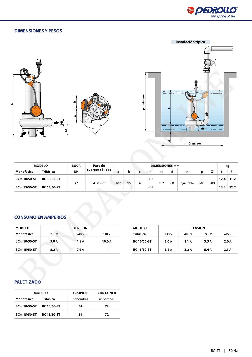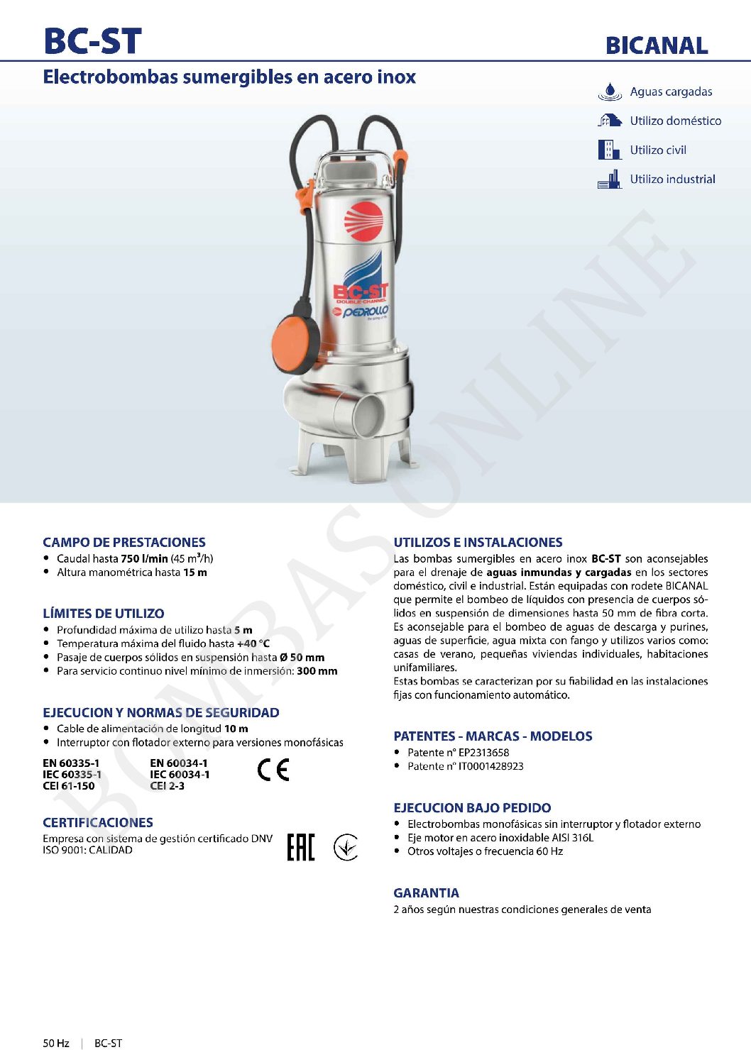 BOMBA DESAGOTE CLOACAL ACERO INOXIDABLE PEDROLLO BCm 10/50-ST – 1 HP MONOFASICA