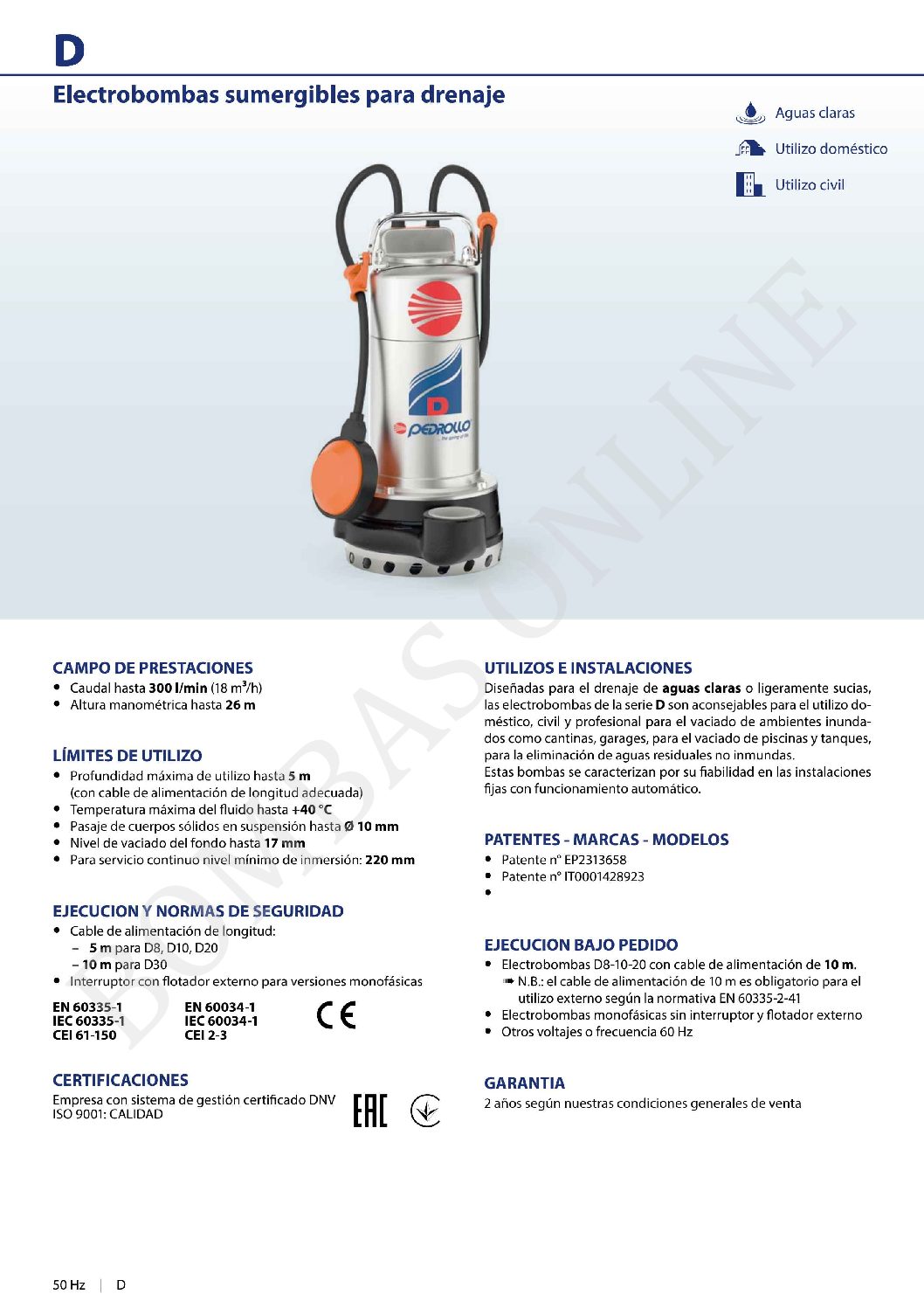 Proyectadas para el drenaje de aguas claras o ligeramente sucias. Son aconsejables para el utilizo doméstico, civil y profesional, para el vaciado de locales inundados como bodegas y garages. Para el vaciado de piscinas y aljibes, para el vaciado de aguas con residuos. Estas bombas se caracterizan por su confiabilidad en las instalaciones fijas con funcionamiento automático.