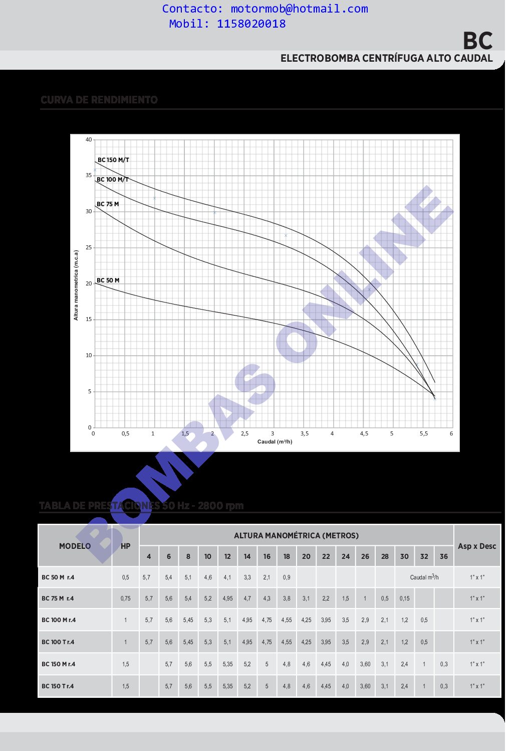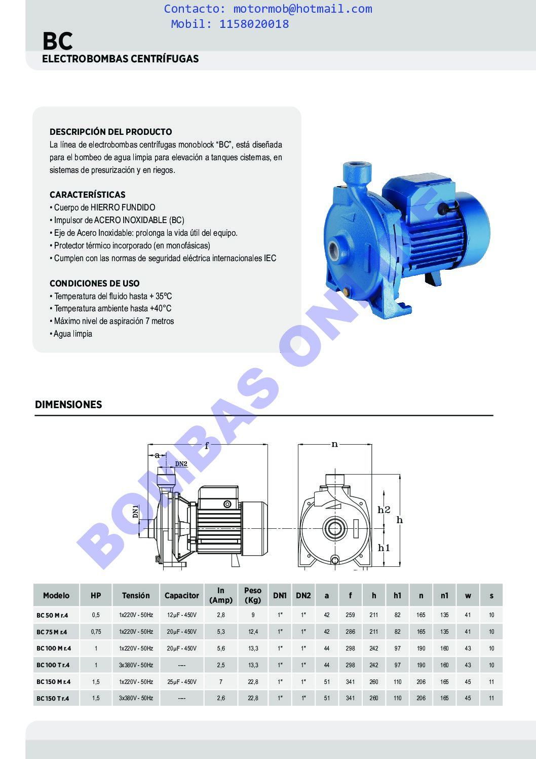 DESCARGUE LA FICHA TECNICA DEL PRODUCTO AQUI: BC FICHA TECNICA BOMBAS ONLINE