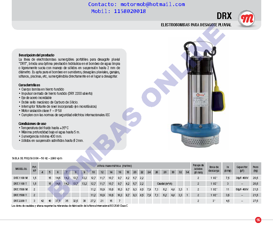 DESCARGUE LA FICHA TECNICA DEL PRODUCTO AQUI: DRX FICHA TECNICA BOMBAS ONLINE