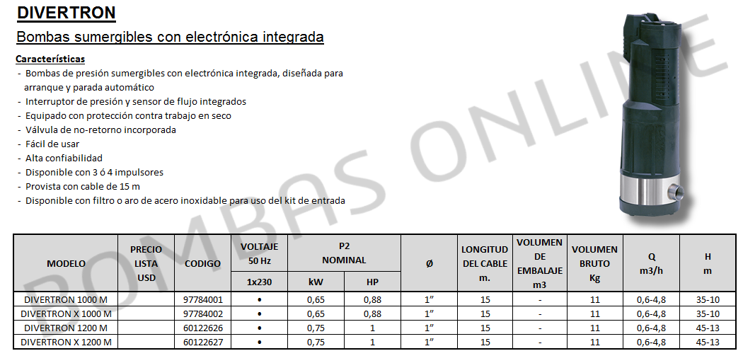 Bomba DAB DIVERTRON 1000 M – Sumergible – Monofasica – Articulo 97784001