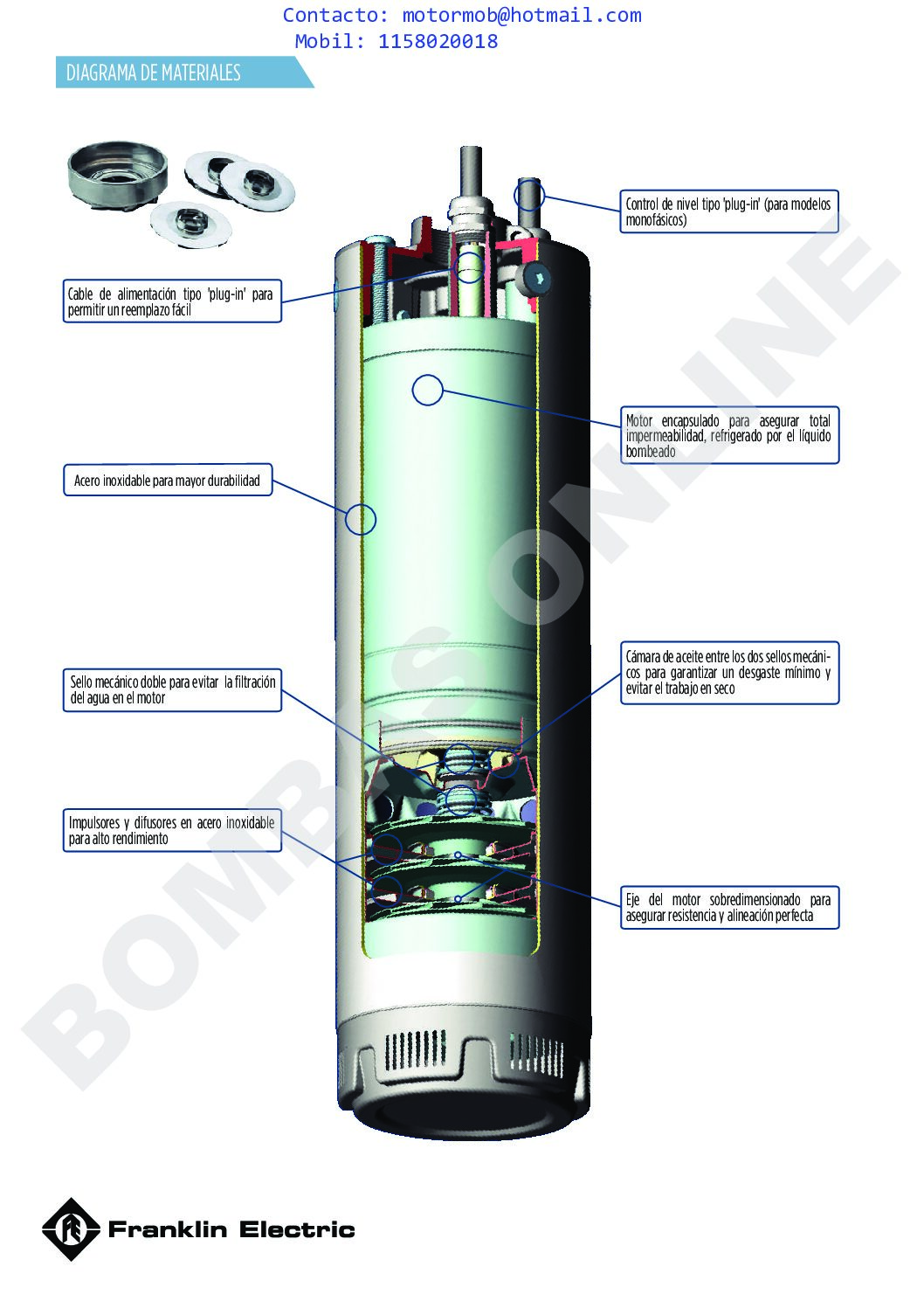 - Motor y bomba unidos por un tubo camisa de acero inoxidable.