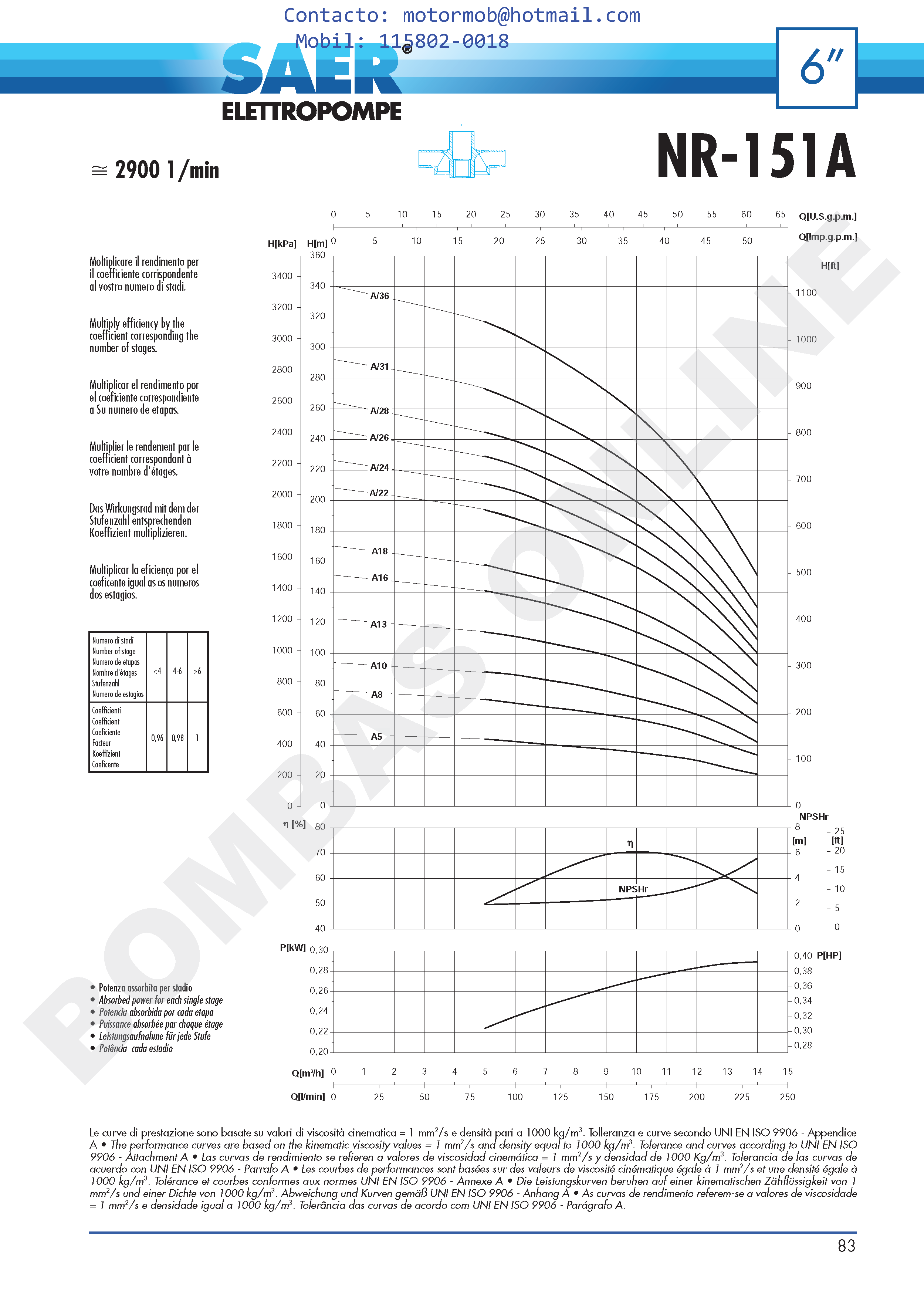 Bomba Sumergible 6 Pulgadas SAER NR-151F/8 (Motor 6 Pulgadas MS152) – Trifásica – 7.5 HP – SAE1035105