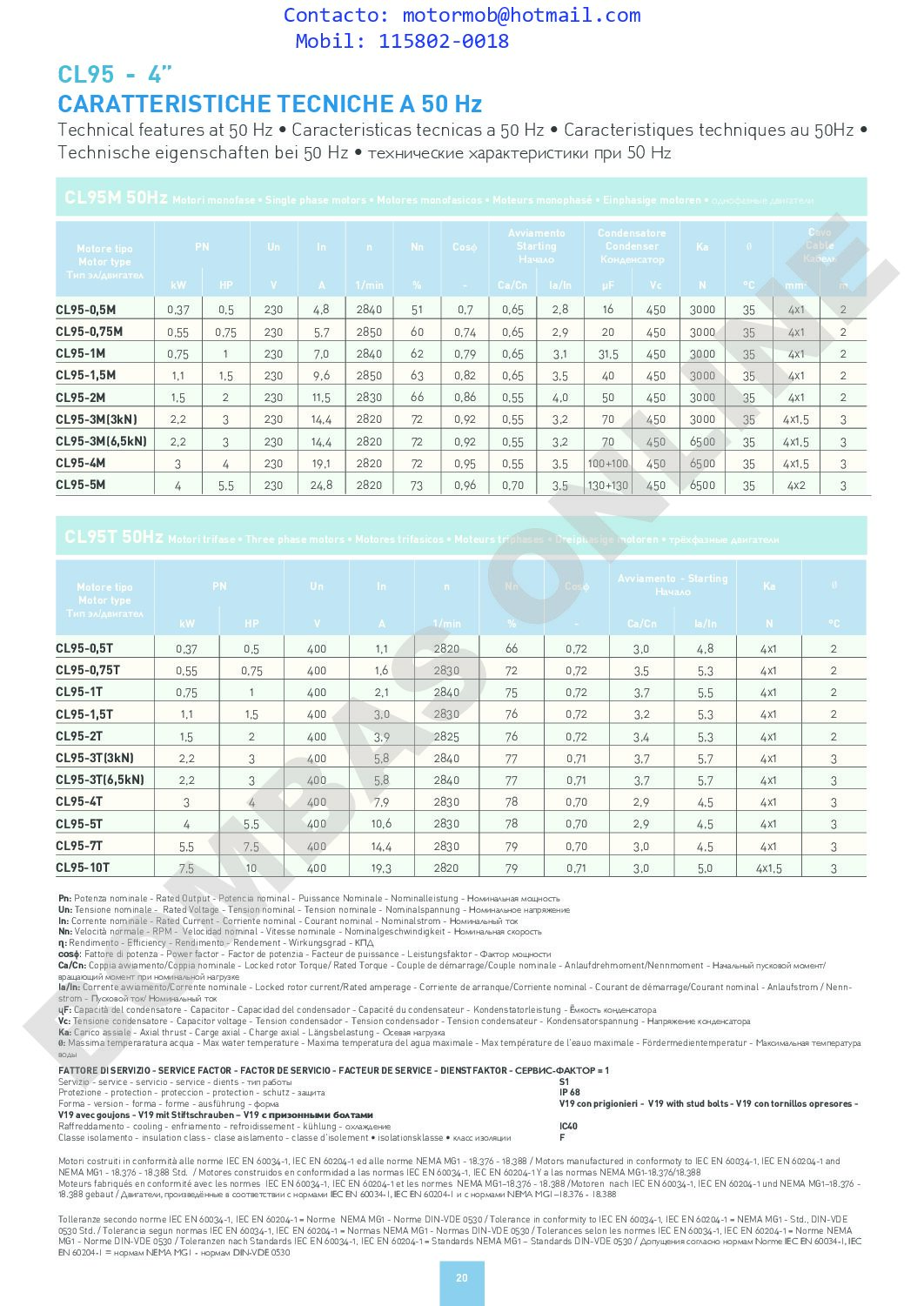 Motor Sumergible 4 Pulgadas – SAER CL95 -0,75 (Alta Carga Axial) – Trifasico – 0,75 HP – SAE1070155