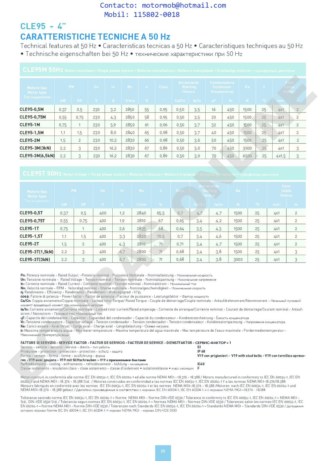 Versión CLE95-O brida de acople en bronce; Versión CLE95-V: brida de acople en acero inox. AISI 304. Versión CLEXV95 eje de acero DUPLEX, brida de acople y carcasa de acero AISI 316.